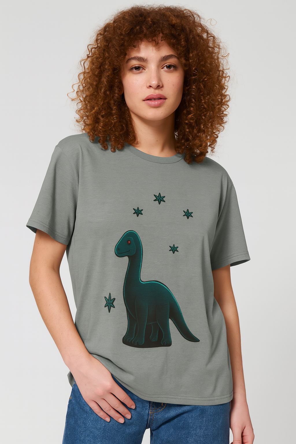 Step into prehistoric charm with a celestial twist. This playful sauropod design brings starry-eyed wonder to your everyday wardrobe.