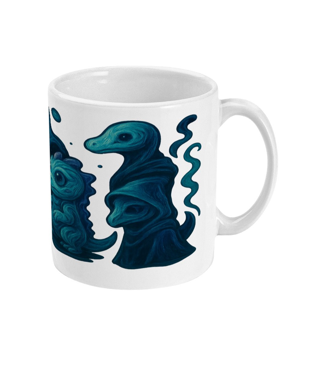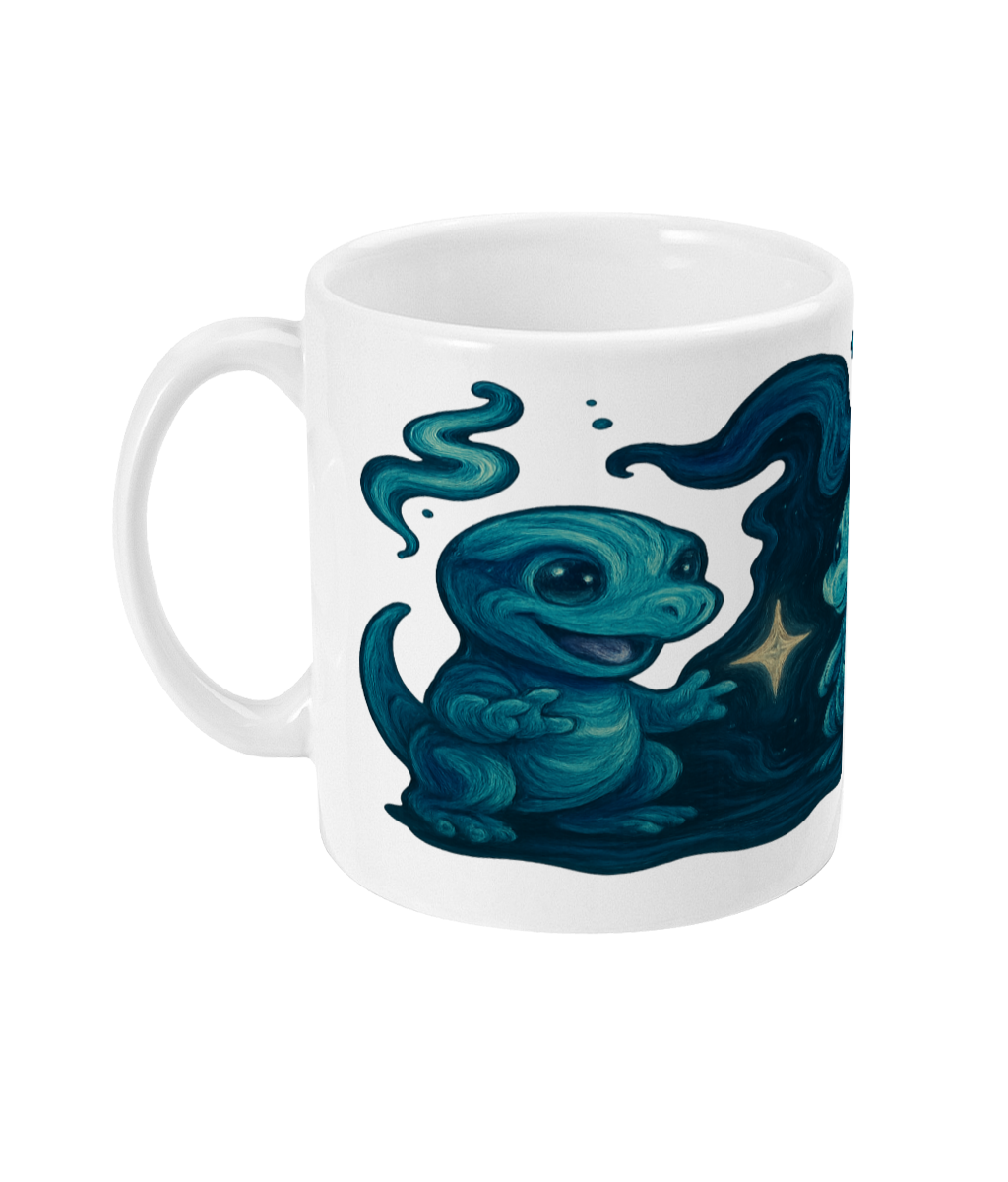 This 11oz ceramic mug showcases three celestial familiars — blue dragon-like creatures swirling in arcane energy. One cradles a glowing star, anchoring the design in cosmic mystery. A perfect companion for fantasy lovers, anime fans, and dreamers of the astral.